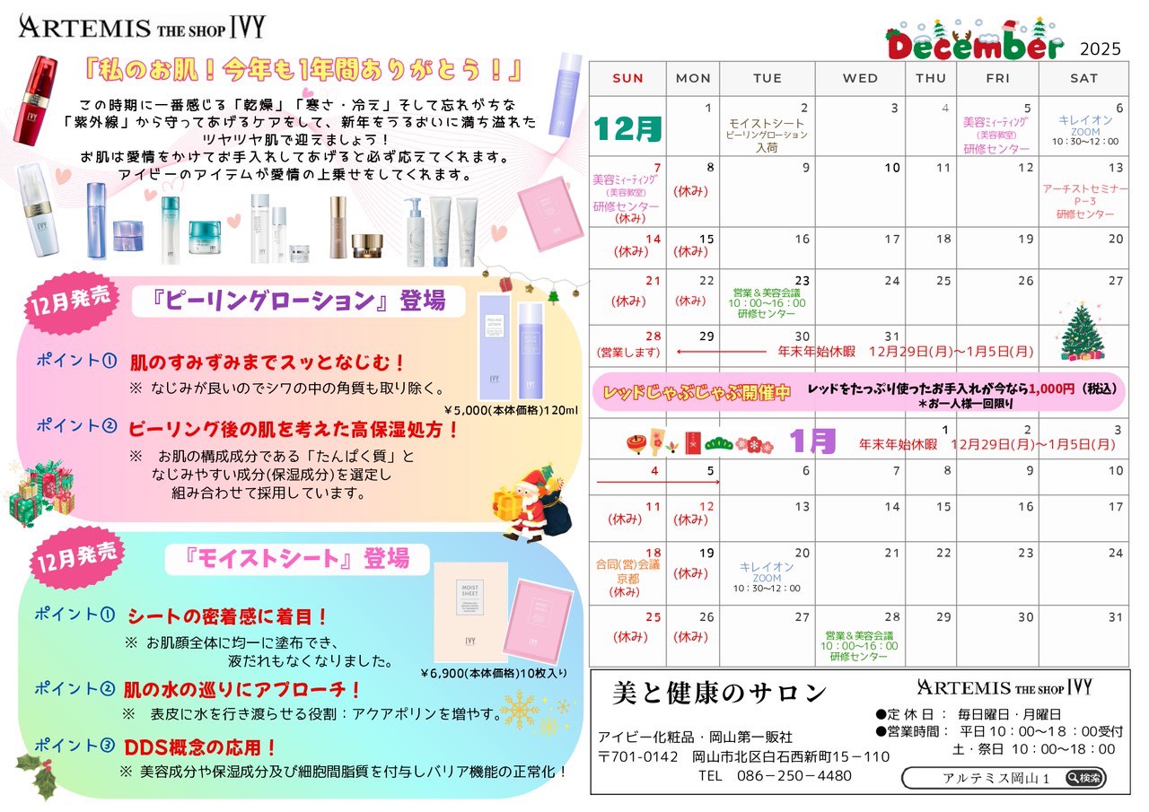 12月のアイビーニュースをお知らせします。 この時期に一番感じる「乾燥」「寒さ・冷え」そして忘れがちな「紫外線」から守ってあげるケアをして、新年をうるおいに満ち溢れたツヤツヤ肌で迎えましょう!